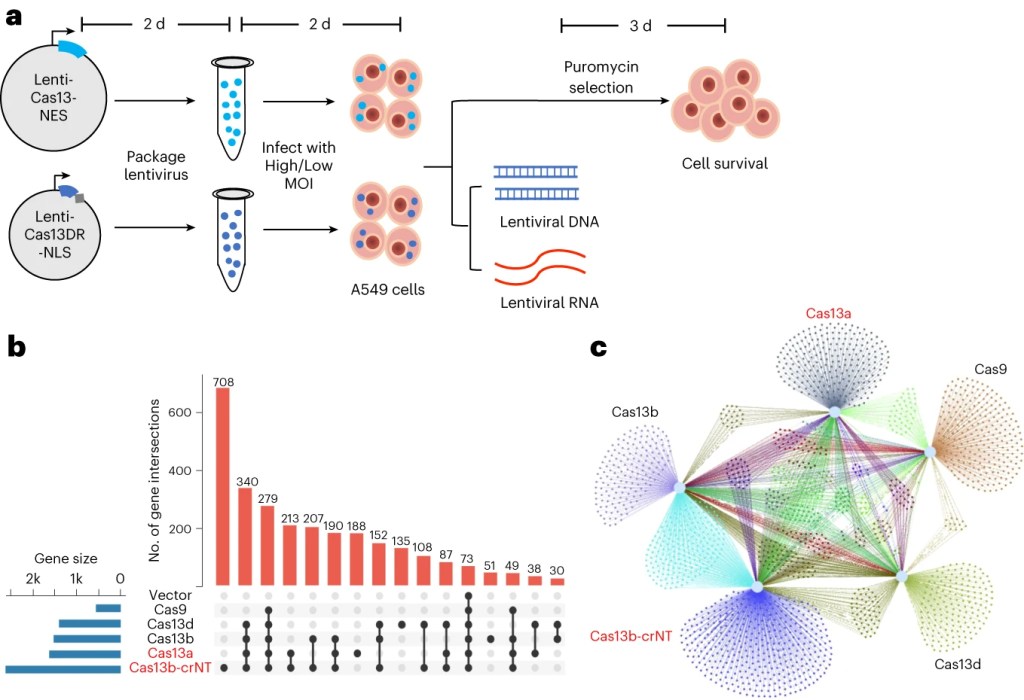 Our most recent finding (published in Nature Biomedical Engineering 2023; in collaboration with Teng Fei lab at Northeastern University) reveals a surprising off-target mechanism of Cas13, which can intrinsically target host RNA in mammalian cells through previously unappreciated mechanisms. This intrinsic RNA targeting mechanism limits the application of Cas13 using viral vectors as delivery methods.