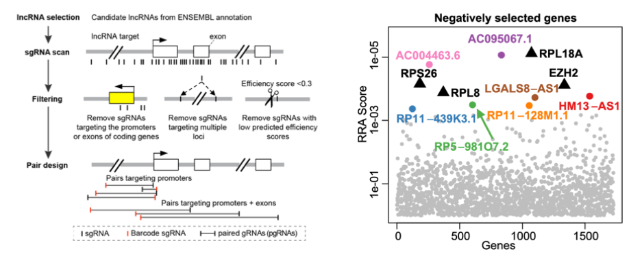 Figure 5. lncRNA screening: designing algorithm (left) and identifying top hits (right) using CRISPR screening.